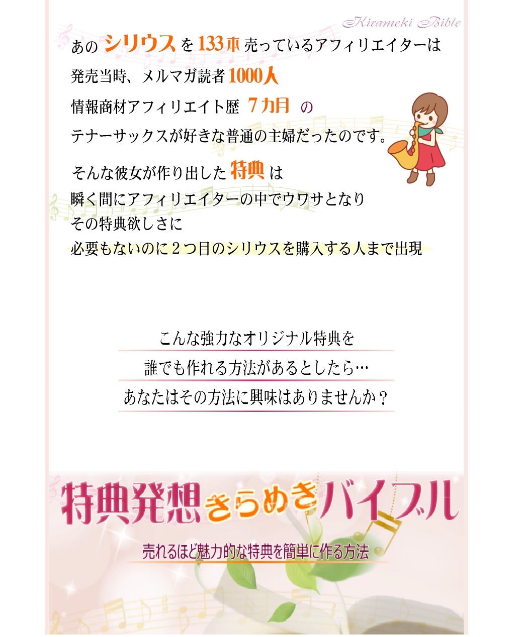 せっかくのチャンスは、ゲットしないともったいないです。 もしかしたら、あなたのゴールデンタイムは“今”到来しているのかもしれません。 もしかしたらもしかして、チャンスの神様が“今”あなたの前に現れているのかもしれません^^ 煽るわけでもありませんが、ただ、私があの時に感じた『このままじゃダメ』という同じ気持ちが、 今あなたの中に少しでもあるのであれば、どんなスタイルにしろ、行動するしかないのです。 私に、そのお手伝いをさせていただけることができたら幸いです。 特典発想きらめきバイブル 〜売れるほど魅力的な特典を簡単に作る方法〜 |